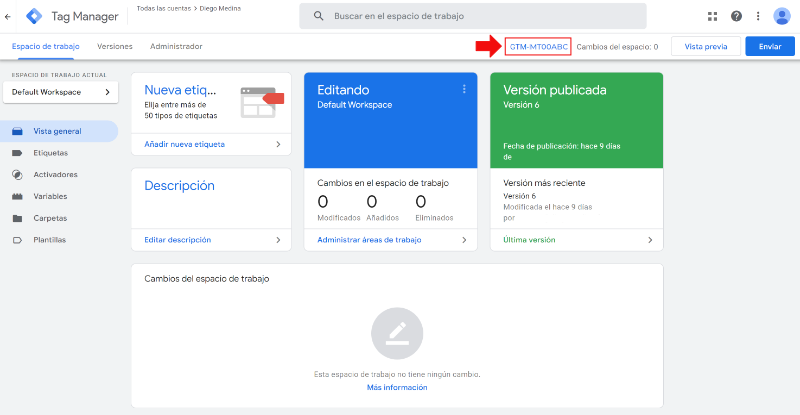 Para ello dirígete a la vista general de tu contenedor. Allí encontrarás el código identificador que comienza por GTM.