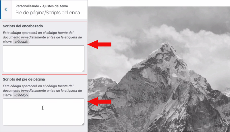 En el caso de Genesis acudimos al personalizador/pie de pagina-scripts del encabezado. Ahí encontraremos los dos campos que situarán cada código antes del cierre de la etiqueta <head> y <body> .