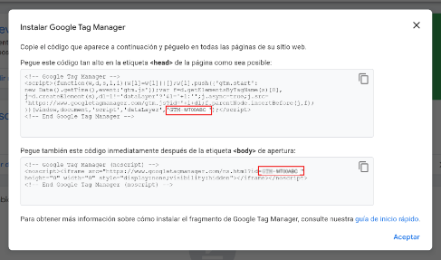 Para ello dirígete a la vista general de tu contenedor. Allí encontrarás el código identificador que comienza por GTM.