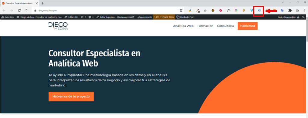 Esta extensión se encarga, entre otras cosas, de analizar en cada web si encuentra instalada la etiqueta de GTM. Además es capaz de dar otros datos muy interesantes como los datos recogidos por el dataLayer o el snippet de código insertado. Para obtener toda esta información únicamente tenemos que hacer clic sobre el icono de la extensión: